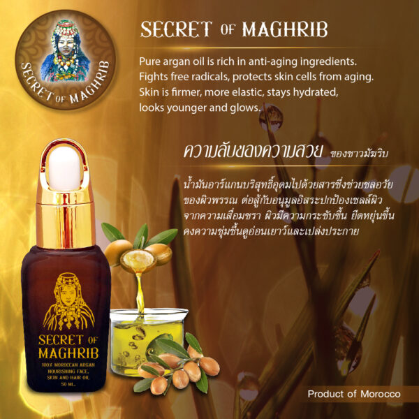 Secret of Maghrib –is the secret of beautiful skin. With the concept of using natural products and methods to maintain skin, face, lips and hair, keep it moisturized, youthful and radiant, coupled with the science of balancing sebum. This is the traditional wisdom of the Berber tribe in North Africa,leading to more lasting results without side effects for beautiful and healthy skin. It contains 100% pure and organic Argan Oil, a premium grade selected source from Southwestern Sahara in Morocco. It is a totally cold process. Secret of Maghrib has been certified organic by CCPB / and to this end meets the regulatory standards of USDA / US NOP